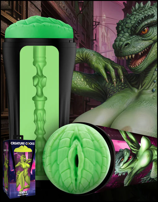 Unleash your wildest fantasies with the Fuckzilla Stroker! This monstrous green lizard's hungry, scaly hole offers a one-of-a-kind pleasure experience. Its stretchy, high-quality, body-safe rubber tunnel is filled with intricately designed grooves, ribbed valleys, and captivating textures for an incredible journey. A hard plastic case keeps the stroker safe when not in use and gives you a secure hold during your sessions. Easy clean-up is guaranteed with the open-ended design; just let warm water and mild soap flow through. For a personalized experience, adjust the suction intensity with the provided silicone plug. This stroker promises unparalleled adventures.