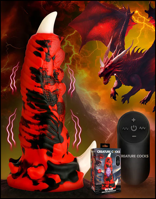 Unleash your wild side with the Red Talon Fantasy Dildo! This enticing red and black dragon finger boasts a prominent white talon on the tip and another at the base for added sensation. Experience thrilling pleasure as you ride the shaft, designed with ribs, bumps, grooves, and a scaly texture for a truly exhilarating feel. With 3 speeds and 7 powerful vibration patterns controlled by a handy remote, you're in charge of the adventure. Enjoy hands-free play thanks to its sturdy suction-cup base that sticks to any flat surface. Crafted from premium, body-safe silicone, it's also waterproof (IPX7) and rechargeable, perfect for shower or bath play.