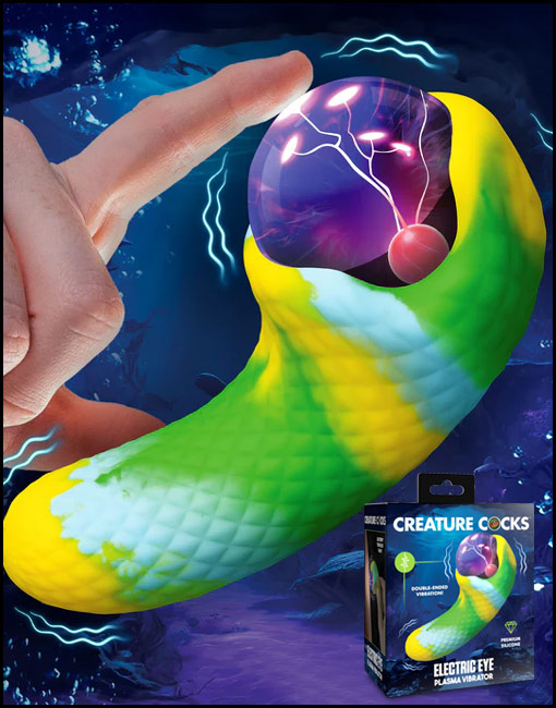 Transform your self-pleasure experience with the Electric Eye Plasma Vibrator, a fantastical creature adorned with scaly green-blue-yellow textures. The unique touch-activated plasma eye glows with pink electric sparks, lighting up your personal moments. Feel the power of its dual motors with 3 speeds and 7 patterns of vibrations at both ends. Made from high-quality textured silicone, this vibrator enhances every touch. Conveniently rechargeable via USB, it's also IPX5 splashproof, ensuring durability through water splashes. Immerse yourself in the magical allure of this one-of-a-kind device.