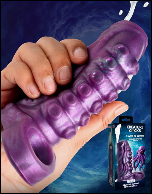 Want something that will enhance your sex life and take your roleplay to the next level? The Siphon Squirting Penis Enhancer is here to reignite passion and bring fresh excitement to the bedroom. With intricate grooves, ridges, and rows of tentacle suckers, it delivers mind-blowing stimulation that elevates every experience. Tired of toys that don't integrate with your own strap-ons or allow you to feel pleasure simultaneously? This innovative design slips over your shaft or with a strap-on while maintaining stimulating sensations with its open-tip design. For those wanting stimulation on their head, this is for you! The C-ring attached at the base keeps it in place while also increasing your power to last longer while highly stimulated! And for an added twist, the built-in squirt feature lets you fill your partner up with lube, cream, jizz, or squirt with ease, thanks to its user-friendly bulb or syringe. Crafted with ultra-smooth, stretchy silicone, it ensures not only unmatched comfort but also peace of mind during use. Don't settle—turn up the heat today!