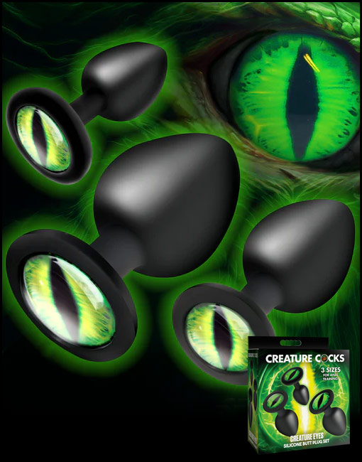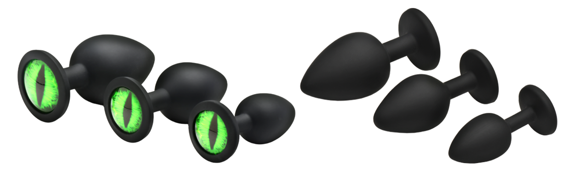 Train yourself to take in larger and larger sizes with the Creature Eye Silicone Butt Plug Set! Enjoy a small, medium, and large size that tests your limits as you train your back entry! This alluring plug features a vivid green cat-eye, making a bold statement when playing with a partner. Crafted from high-quality, body-safe silicone, it offers a smooth and delightful touch. The design includes a tapered tip for effortless insertion, paired with a slim neck and a wide base to guarantee it stays put. Elevate your intimate moments with a touch of fantasy, enjoying both comfort and a unique visual appeal that will leave your partner enchanted by your gaze!