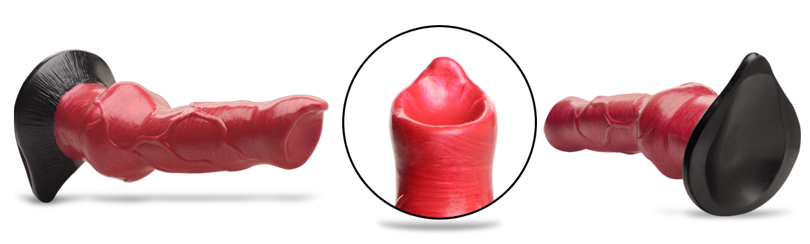 Pounce into playtime with this Hell-Hound Canine penis! The large, red dildo has bulbous testicle glands in a knot above the base, thick veins along the shaft, a concave head with pointed tip and a sturdy black base. Enjoy hands-free by using the strong, suction-cup base against a wall or flat surface or pair it with a strap-on harness for pegging play! Use only with water based lubricant. Made of premium silicone, it is body safe and phthalate-free.