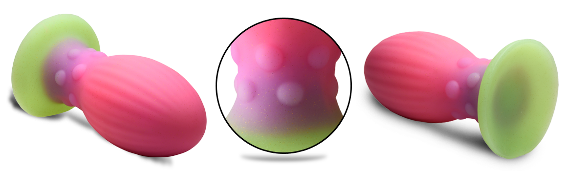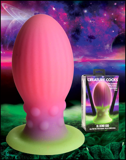 Expand your horizons beyond the known universe and get one of our alien xeno eggs by Creature Cocks! This pink, purple and green egg glows in the dark so you can have a radioactive looking alien egg! Or you can imagine that you are taking in a whole new kind of creature and their especially unique phallus! With ribbed sides and a bumpy neck you can enjoy extra stimulation. The tapered tip helps you insert it and the round, wide body gives you a satisfying fill! Use it vaginally and enjoy laying the egg as you push it out post-penetration! The egg is made from premium, phthalate-free silicone and is plush, silky smooth. Use only with water-based lubricants. After use, wash with warm water and mild soap then rinse and spray with a toy cleaner. Store in a cool, dark place. To make the toy glow, expose it to sunlight or a UV flashlight.