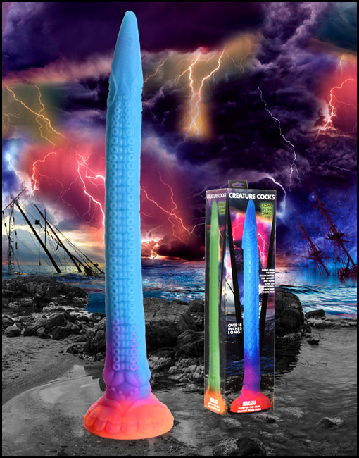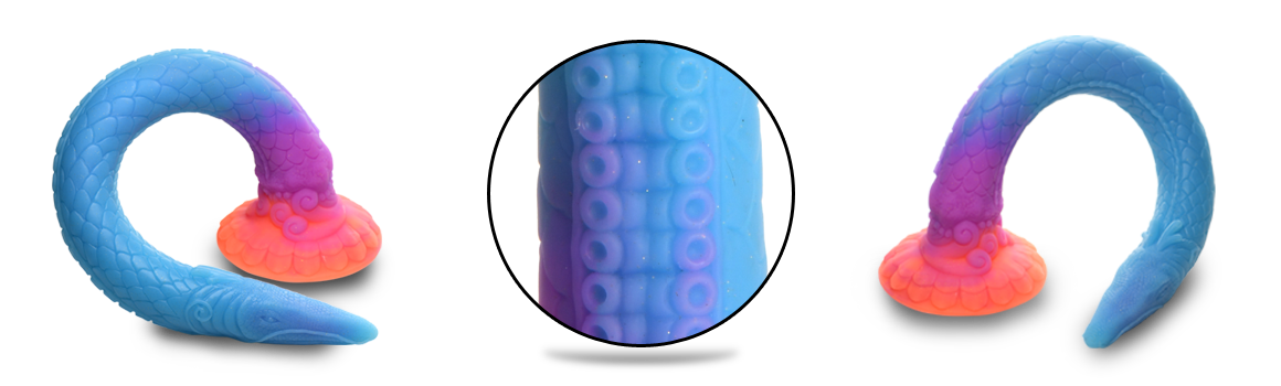 This may be the most beautiful anal hose you've ever seen! This 16 inch long dildo is perfect for snaking your drain, and this time it looks like a mystical sea snake! With a base that is sunburst colors of yellow and orange and a body that is shades of purple and blue, it also has fine, detailed designs along the body and glitter embedded in it, too! From the flower petal base to the scaled and sucker-covered body to the sea snake head that has gills, eyes and a mouth, this is a gorgeous toy you'll be proud to show off or privately enjoy! Made out of premium, phthalate-free silicone, it has a firm core and is flexible and smooth. When exposed to UV light or sunshine, it also glows in the dark! Use the wide, suction-cup base to keep it in place and use it hands-free, or combine it with a compatible strapon harness for kinky cosplay, fantasy roleplay, or hot pegging play! After play is over, wash the dildo with warm water and soap and use a toy cleaner to spray clean. Wipe dry and store in a cool, dark place out of direct sunlight.