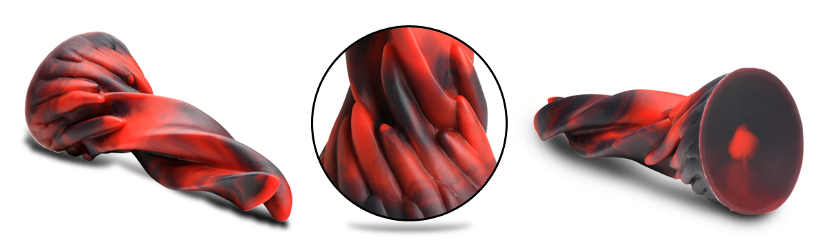Enhance your fantasy roleplay, kinky cosplay and sensual penetration play with this Twisted Tongues Creature Cocks dildo! From the wide, girthy base two tongues rise up, twisting around each other to form a towering tongue that will soon enter the depths of your holes! The core is firm and bendable and the edges are soft and squishy. Made out of phthalate-free, body-safe, premium silicone, it is silky smooth and slightly tacky. The bold black and red colors add to this demon-themed monster tongue! Dress up in your sexiest seductor/seductress outfit and strap this into your harness for pegging play and make your partner's fantasies come alive! Press the wide, suction-cup base against any flat surface and ride it hands-free! Use plenty of water-based lubricant and enjoy the girth and sensation from this uniquely shaped dildo!