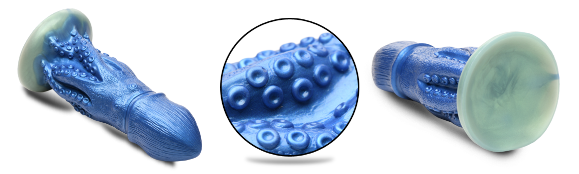 Deep from the ocean depths comes a creature that has come for dark caves and warmer waters. This iridescent blue octopus has eyes on the side of its head, eight tentacles with textured suckers on them, and a bulbous head that has a tapered tip. Take a deep breath and go deep with this girthy dong. Squishy and soft on the outside, it's firm on the inside and is going to fit to your form as you let it slip inside and penetrate you. Made out of premium, phthalate-free silicone, it is body-safe to use with water-based lubricants. The suction cup base can be placed on any flat surface for a hands free ocean exploration. Combine it with a strapon harness for couples fantasy roleplay. Include it in kinky cosplay or indulge in hentai tentacle fetish fantasies as you dream of the Fisherman's Wife and her Octopus lover and stretch your limits while slowly sliding this inside! Use it solo or with your partner to spice up your sex life! After use, wash with warm water and mild soap, then spray with a toy cleaner and wipe dry. Keep out of direct sunlight. Store in a cool, dark place.