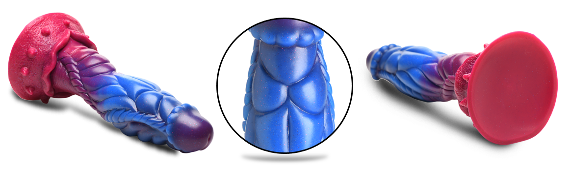 Imagine a fantasy lover with a cosmic cock. The brilliant and rich blue, purple and pink colors pop out amongst the darkness of the night. Look closer and you'll see the glitter that mimics a star-filled sky. The round, phallic head is easy to pop inside. As you slide it in, enjoy the large bumps, the roped lines, and the thick ridge along the center. The numerous textures add scintillating stimulation as its girth and size open you up to expand your pleasure senses! Made out of premium, phthalate-free silicone, it is body-safe and best used with water-based lubricants. Firm yet flexible, it has a firm core and squishy outer layer that adapts to the curves of your body. The suction cup base can be placed on any flat surface for a hands free ocean exploration. Combine it with a strapon harness for couples fantasy roleplay. Use it in kinky cosplay and combine it with an outfit or costume! After use, wash with warm water and mild soap, then spray with a toy cleaner and wipe dry. Keep out of direct sunlight. Store in a cool, dark place.