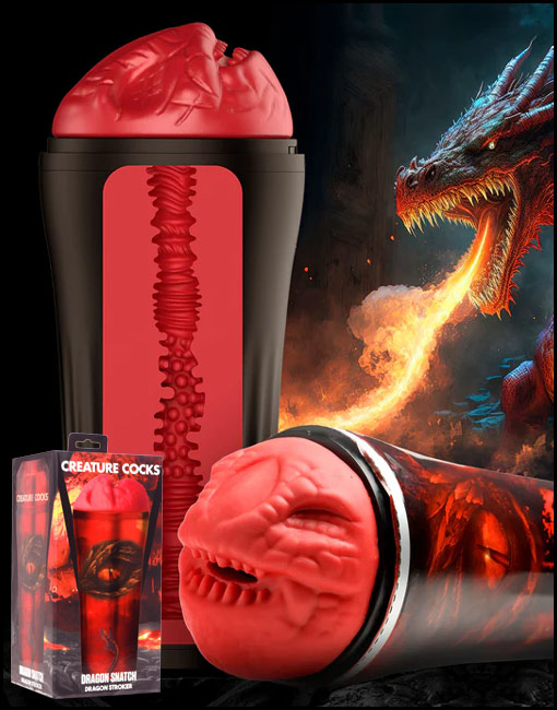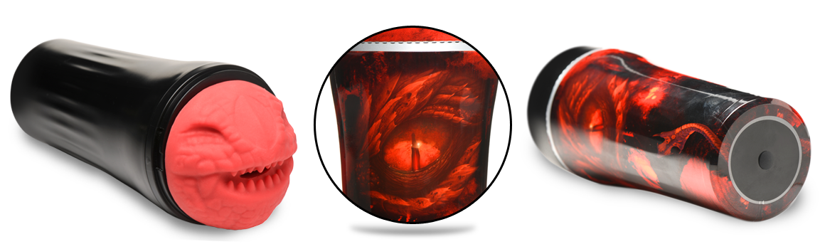 Are you ready to be ravaged by fire-breathing dragons? This scaly, red dragon stroker has nubbed teeth and a dragon mouth that is ready to take in your hard rod! Inside the stroker are rows of textured ribs, grooves and nubs to drive you crazy as you dip yourself inside and enjoy pumping into the tight hole. Control the pressure and suction by using the silicone plug at the base of the case. Keep it in and each pump will add a little pressure and suction for a tighter squeeze! Remove the plug to release it. The case is open ended once the plug is removed so that you can easily rinse and let the water run through it. For an even more thorough clean up process, remove the stroker sleeve and wash it separately before letting it air dry. Place the cap on top once the sleeve is reinserted to keep it free of dust and debris. Use only with water-based lubricants. Enjoy indulging in your kinky fantasies of sci-fi or horror as you give into your dark desires!