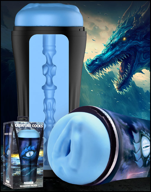 Take on the wonders of the deep sea with this Pussidon Sea Monster stroker! The pale blue stroker has soft, raised lips and a tight little hole for your enjoyment! Inside the stroker are rows of textured ribs, grooves and nubs to drive you crazy as you dip yourself inside and enjoy pumping into the tight hole. Control the pressure and suction by using the silicone plug at the base of the case. Keep it in and each pump will add a little pressure and suction for a tighter squeeze! Remove the plug to release it. The case is open ended once the plug is removed so that you can easily rinse and let the water run through it. For an even more thorough clean up process, remove the stroker sleeve and wash it separately before letting it air dry. Place the cap on top once the sleeve is reinserted to keep it free of dust and debris. Use only with water-based lubricants. Enjoy indulging in your kinky fantasies of sci-fi or horror as you give into your dark desires!