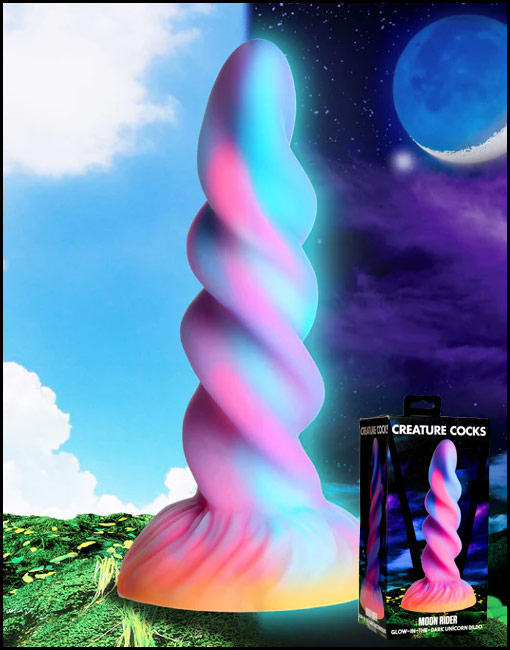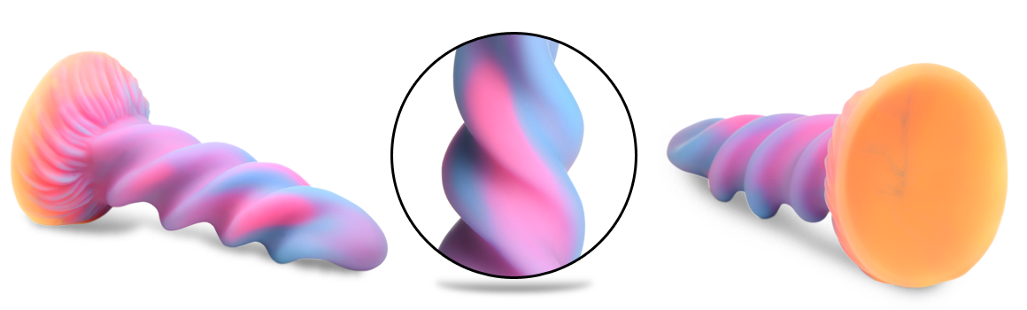 Magic comes in many shapes and sizes, and this Moon Rider Unicorn dildo is the perfect shape for you! The sunburst of purple, blue, pink and yellow colors are bright during the day and when it gets dark the glow in the night! It has a small, pointed tip for easy insertion and a spiral horn with soft, round edges. Made out of premium, flexible, phthalate-free silicone, this dong is body-safe and best used with water-based lubricants only. Enjoy hands free rides due to the strong suction cup base! Invite a partner to indulge in kinky cosplay or fantasy roleplay and use their favorite harness to transform this dong into a strapon! Afterward, make sure to wash it with warm water and mild soap, then spray it with a toy cleaner and air-dry. Keep out of direct sunlight and heat.