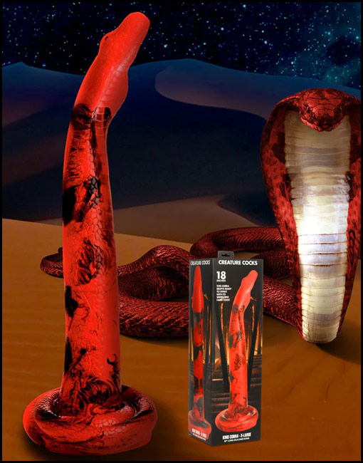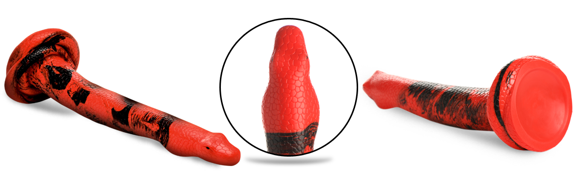 Are you ready to be ravaged? See how good of a serpent charmer you are with this 18 inch Cobra! Designed to uncoil and slither deep inside your rear entry, it is textured with tantalizing details that add intense sensation to your backdoor exploration! The tip of the hose is shaped like a cobra head. You'll enjoy that wide flare of its wide neck as it pops inside. The tapered, round nose makes insertion easy. It has a vibrant red and black body with textured scales that go all the way to the coiled base! Firm and flexible, it is made out of body-safe, premium silicone and is phthalate-free. Use only with water-based lubricants for best results! The base has a strong suction-cup on it so you can have those hands free to guide the snake into your cavern. The wide base is also perfect for combining with a strap-on harness! Enjoy various ways to play with this sinful snake! Enjoy exploring your playful and wild side! Try out some kink cosplay or fantasy roleplay! After use, wash it with warm water and mild soap, then spray it with a toy cleaner and let it air dry.