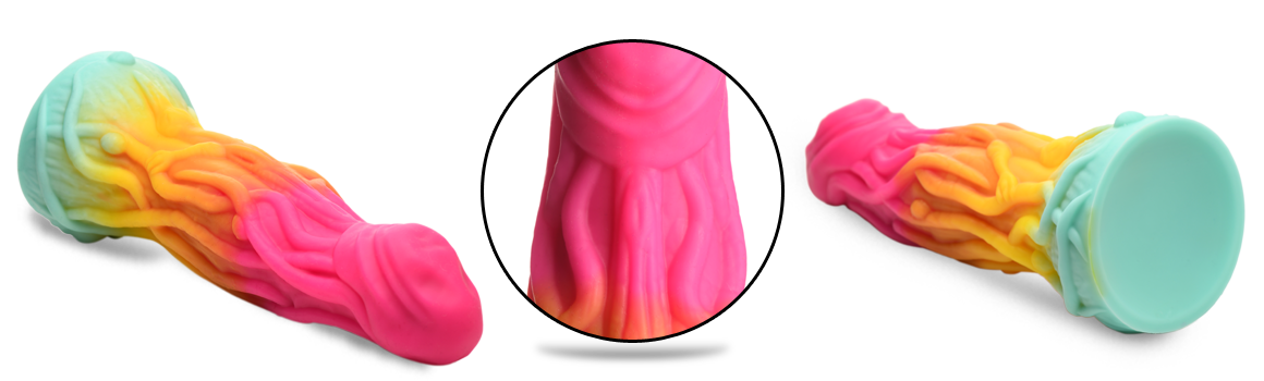 This colorful, shapeshifting chimera dong is thick and textured for your pleasure! Ropey veins wrap and cross over each other as they run down the length of the shaft. The monstrous head is wrinkled and round. From the base of the head extends a small, beaked lizard with arms outstretched and holding on to the rainbow colored shaft. Made out of premium, flexible, phthalate-free silicone, this dong is body-safe and best used with water-based lubricants only. Enjoy hands free rides due to the strong suction cup base! Invite a partner to indulge in kinky cosplay or fantasy roleplay and use their favorite harness to transform this dong into a strap-on! Afterward, make sure to wash it with warm water and mild soap, then spray it with a toy cleaner and air-dry. Keep out of direct sunlight and heat.