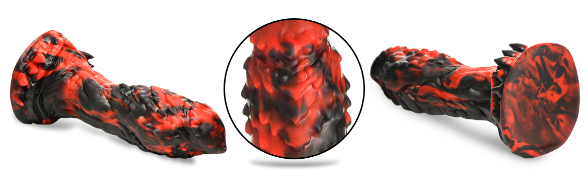 The Reaper comes for more than just your soul! It comes for your hole, too! This red and black dildo is menacingly large with textured ridges, nubs, grooves and spikes on it. The edge of the corona is rimmed with spiked nubs and is wider at the top then the middle. Made out of premium, flexible, phthalate-free silicone, this dong is body-safe and best used with water-based lubricants only. Enjoy hands free rides due to the strong suction cup base! Invite a partner to indulge in kinky cosplay or fantasy roleplay and use their favorite harness to transform this dong into a strapon! Afterward, make sure to wash it with warm water and mild soap, then spray it with a toy cleaner and air-dry. Keep out of direct sunlight and heat.