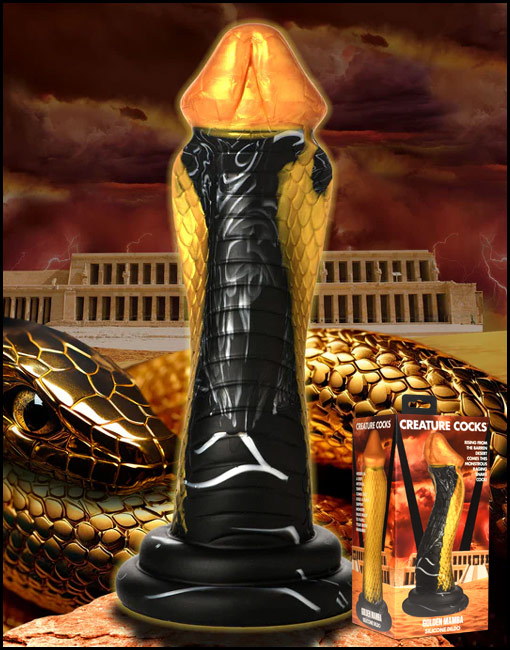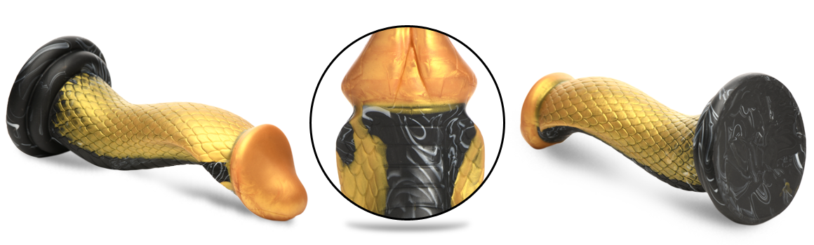 The royal king of cobras, the Golden Snake of your dreams has arrived! The brilliant, shining gold and black body has an exaggerated S-curve that will hit your G-spot or P-spot. The wide hood at the top stretches you open and adds extra, soft and scaly texture while the round, dong-shaped head slides easily inside. Made out of premium, flexible, phthalate-free silicone, this dong is body-safe and best used with water-based lubricants only. Enjoy hands free rides due to the strong suction cup base! Invite a partner to indulge in kinky cosplay or fantasy roleplay and use their favorite harness to transform this dong into a strapon! Afterward, make sure to wash it with warm water and mild soap, then spray it with a toy cleaner and air-dry. Keep out of direct sunlight and heat.