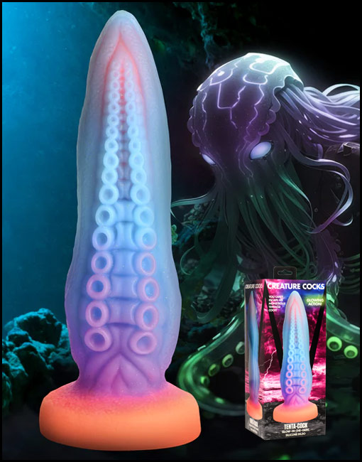 It reaches for you, and every sucker tastes your skin… This thick tentacle has two rows of gradually bigger suckers as you get towards the base. Along each side are thick, calloused ridges that softly and sensually rub against you as you ride it. The tapered tip makes insertion a bit easier as you take on this girthy octopus arm! Its hues of blue, purple and orange glow bright green in the night when exposed to UV light! Made out of premium, flexible, phthalate-free silicone, this dong is body-safe and best used with water-based lubricants only. Enjoy hands free rides due to the strong suction cup base! Invite a partner to indulge in kinky cosplay or fantasy roleplay and use their favorite harness to transform this dong into a strapon! Afterward, make sure to wash it with warm water and mild soap, then spray it with a toy cleaner and air-dry. Keep out of direct sunlight and heat.