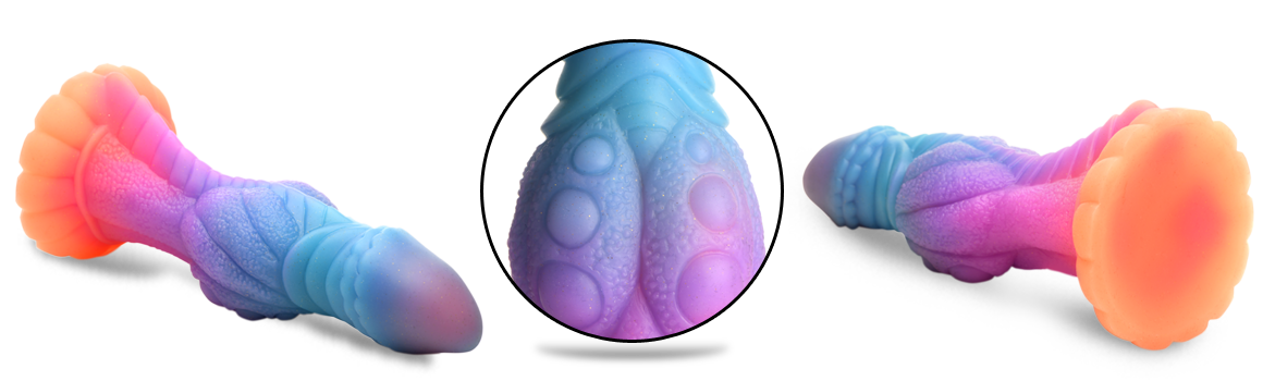 Indulge in this highly stimulating Galactic Alien dong! This colorful, glitter-filled sunburst of pink, orange, blue and purple glows green in the dark! Its unique texture has layers, grooves, bumps, ridges and both smooth and gravely surfaces that slide in effortlessly as they stretch you open! Its large head has a tapered tip that helps with insertion, and then you can enjoy the feeling of a large bump in the center where it gets thick again. Made out of premium, flexible, phthalate-free silicone, this dong is body-safe and best used with water-based lubricants only. Enjoy hands free rides due to the strong suction cup base! Invite a partner to indulge in kinky cosplay or fantasy roleplay and use their favorite harness to transform this dong into a strapon! Afterward, make sure to wash it with warm water and mild soap, then spray it with a toy cleaner and air-dry. Keep out of direct sunlight and heat.