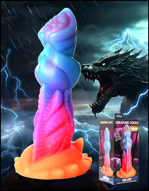 Take a deep dive into the pleasure with this sea monster dildo! Its glow-in-the-dark rod illuminates the dark depths of the ocean so you can easily find your way to this beacon of pleasure. Made out of premium, phthalate-free silicone, this body-safe dildo has a firm core and soft outside so it can squeeze into your tightest spots. Artfully crafted with a sunburst of layered blues, oranges, pinks and purples it also has shimmering glitter scattered throughout the shaft like stars strewn across the sky. But the most seductive aspect is the shape and size! The pointed tip easily slips inside, then you get to stretch your limits as you enjoy the massive bumps, ridges, ribs and textured forms along the shaft that give it a unique and otherworldly sensation as you ride it! The wide, flanged base has a suction-cup function as well so you can ride it hands-free. Or pair it with a strap-on harness and get into some kinky cosplay or fantasy roleplay! After play, wash it with warm water and mild soap before spraying with a toy cleaner and patting it dry. Keep out of direct sunlight and heat.