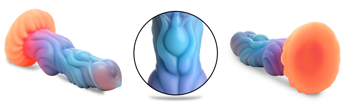 Feast your eyes on otherworldly sights with this alien beast! Its glow-in-the-dark rod illuminates the dark and uncertain night and its extraterrestrial form will send shivers of pleasure down your spine! Made out of premium, phthalate-free silicone, this body-safe dildo has a firm core and soft outside so it can squeeze into your tightest spots. Artfully crafted with a sunburst of layered blues, oranges, pinks and purples it also has shimmering glitter scattered throughout the shaft like stars strewn across the sky. But the most enticing is the shape and size! The pointed tip easily slips inside, then you get to stretch your limits as you enjoy the massive bumps, ridges, ribs and textured forms along the shaft that give it a unique and otherworldly sensation as you ride it! The wide, flanged base has a suction-cup function as well so you can ride it hands-free. Or pair it with a strapon-harness and get into some kinky cosplay or alien abduction roleplay! After play, wash it with warm water and mild soap before spraying with a toy cleaner and patting it dry. Keep out of direct sunlight and heat.