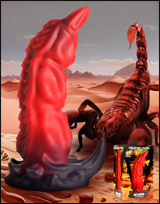 This thick, Scorpion tail is ready to penetrate you! This red and black shaft is embedded with silver glitter that shines like little specks of Formica. The segmented bulges curve to hit your G-spot or P-spot. The backside has scaled ridges that add extra texture with each stroke. The stinger tip has a tapered point that makes insertion easy and at the base is a second horn-like stinger that rubs against your clit, perineum, or balls. The wide base provides powerful suction so you can go hands-free by placing it on any flat surface to keep it in place. You can also combine it with a compatible strap-on harness for pegging play! Made from premium, phthalate-free silicone, it has a firm core and soft, silky surface. Explore every sci-fi, fantasy, roleplay, or cosplay scene you want with this epic adult toy! Use only with water-based lubricants for best results. After play is over, wash the dildo with warm water and soap and use a toy cleaner to spray clean. Wipe dry and store in a cool, dark place out of direct sunlight.