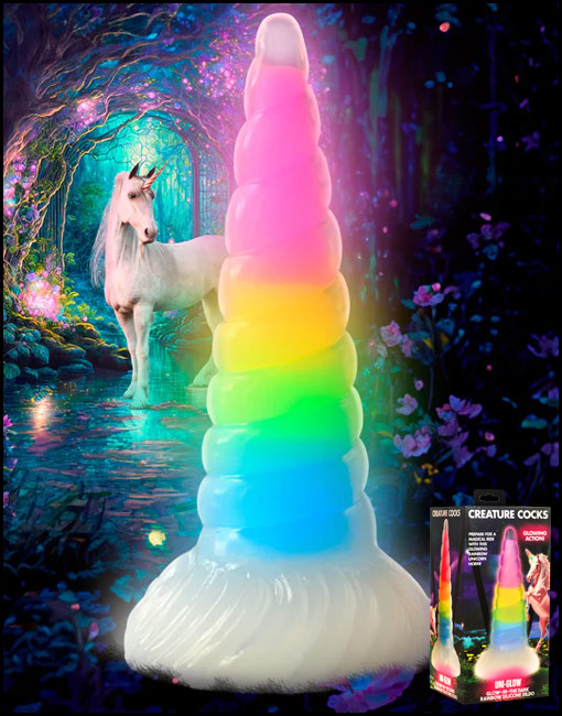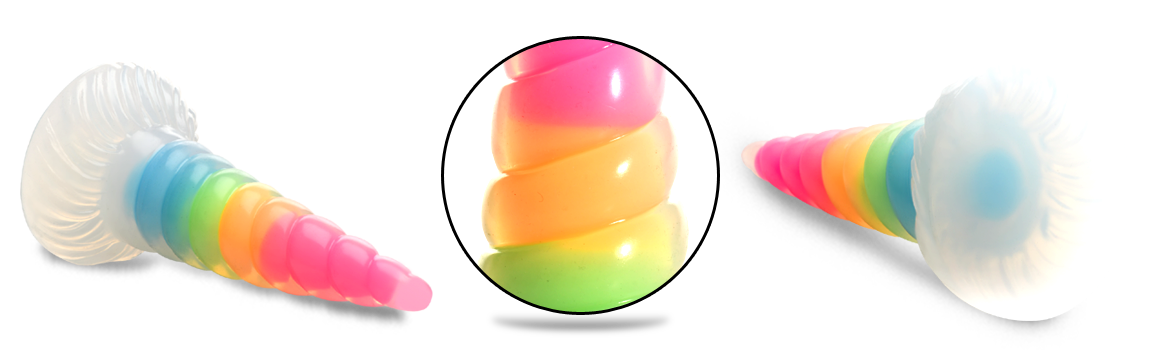 Make your fantasies come to life with this glow-in-the-dark unicorn horn! The see-through outer layer is a spiral horn with a tapered tip for easy insertion and a wide base! Inside, the rainbow core glows in the dark! Made out of premium, flexible, phthalate-free silicone, this dong is body-safe and best used with water-based lubricants only. Enjoy hands-free rides due to the strong suction cup base! Invite a partner to indulge in kinky cosplay or fantasy roleplay and use their favorite harness to transform this dong into a strap-on! Afterward, make sure to wash it with warm water and mild soap, then spray it with a toy cleaner and air-dry. Keep out of direct sunlight and heat.