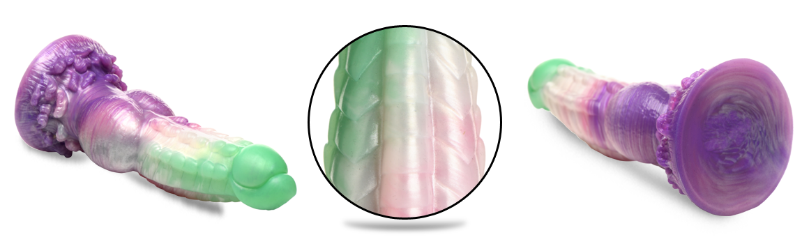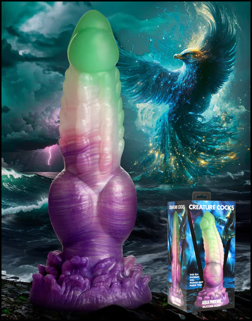 Let your mythical fantasies take flight! This unique Aqua Phoenix dies and is reborn not by fire but with the power of the churning seas! The jade green and purple dong has rows of firm, ribbed ridges along the shaft, smooth tip, round knots near the bottom of the rod and a plumage of crashing waves at the base. This meaty dong has a tapered head for easier insertion, but a girthy, thick body that will stretch your limits! Made out of premium, flexible, phthalate-free silicone, this dong is body-safe and best used with water-based lubricants only. Enjoy hands free rides due to the strong suction cup base! Invite a partner to indulge in kinky cosplay or fantasy roleplay and use their favorite harness to transform this dong into a strapon! Afterward, make sure to wash it with warm water and mild soap, then spray it with a toy cleaner and air-dry. Keep out of direct sunlight and heat.