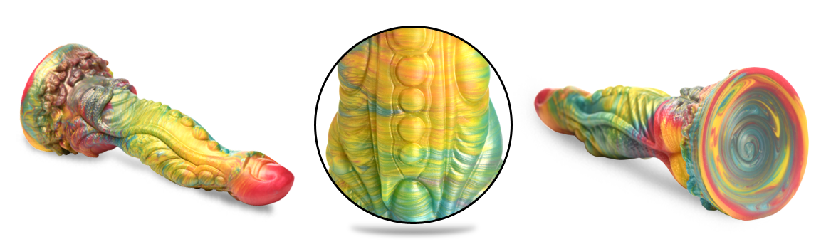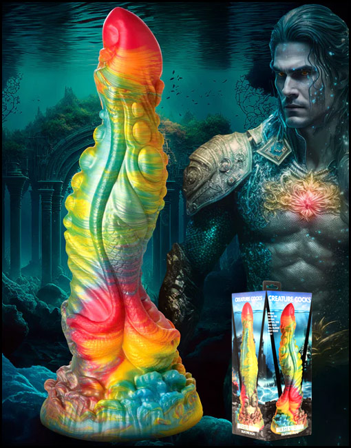 Ready to go deep? This extra long Majestic Merman dong is perfect for exploring the depths of your desires! With iridescent rainbow colors that really pop out among your other toys and gear, this toy is eye-catching and beautiful! The S-shaped curve to the shaft helps it hit all the right spots. As it is penetrating you thoroughly with over 10 inches of length, the bumps, grooves, ridges, swirls, curves and nubs stimulate you even more! This meaty dong has a tapered head for easier insertion, but a girthy, thick body that will stretch your limits! Made out of premium, flexible, phthalate-free silicone, this dong is body-safe and best used with water-based lubricants only. Enjoy hands free rides due to the strong suction cup base! Invite a partner to indulge in kinky cosplay or fantasy roleplay and use their favorite harness to transform this dong into a strap-on! Afterward, make sure to wash it with warm water and mild soap, then spray it with a toy cleaner and air-dry. Keep out of direct sunlight and heat.