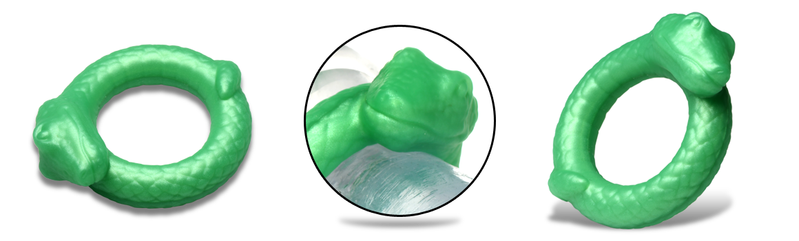 Decorate your dong with this fantasy C-ring! This jade serpent ring delicately wraps around your shaft for a perfect addition to your rod! It can fit over the shaft along or also be stretched to fit around the shaft and under the balls, too! It can enhance your playtime, increase the intensity of climax, and help you stay rigid for longer! Combine this with any fantasy roleplay or creative scene a little more fun!