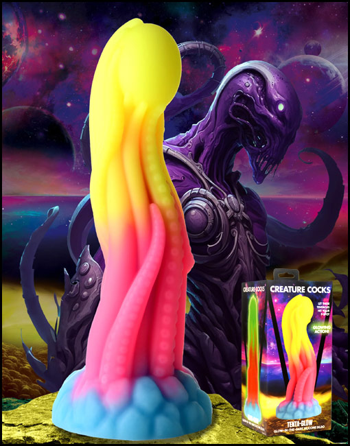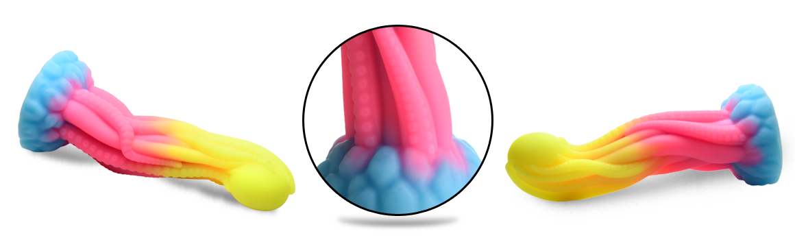 Take your fantasy roleplay, kinky cosplay or creative role play further with tangible fantasy toys from Creature Cocks! This Glow-In-The-Dark Tentacle Dildo might just be the perfect toy to hit every deep spot within you, light up the night, and excite you and your partner! From the light blue base the tangle of thin tentacles reach up towards the round, egg-shaped orb that they hold. Each ropey tentacle is either smooth or textured with little suckers that will massage you and add unique shapes to the shaft. The round egg at the tip helps to massage your P-spot or G-spot and add extra pleasure! Expose it to sunlight or UV light so that it glows neon blue, orange and green in the dark! The wide base provides powerful suction so you can go hands-free by placing it on any flat surface to keep it in place. You can also combine it with a compatible strapon harness for pegging play! Made out of premium, phthalate-free silicone, it has a firm core and soft, silky surface. Use only with water-based lubricants for best results. After play is over, wash the dildo with warm water and soap and use a toy cleaner to spray clean. Wipe dry and store in a cool, dark place out of direct sunlight.