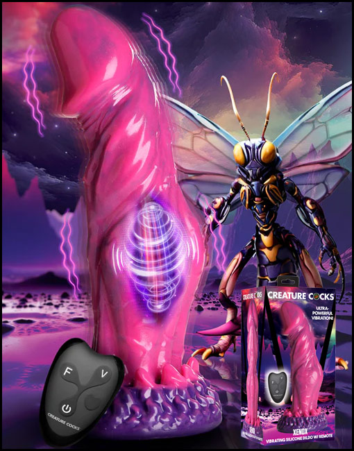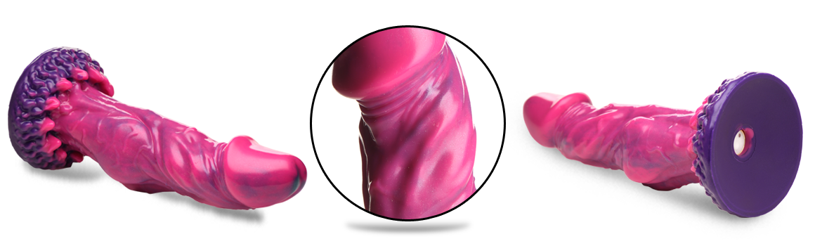 Explore your dark fantasies of giant, buzzing, alien wasps and take on this giant stinger dong! This shiny pink rod has accents of purple, a smooth and tapered tip, a curved shaft, and knots above the spiky base. The wide base provides powerful suction so you can go hands-free by placing it on any flat surface to keep it in place. You can also combine it with a compatible strap-on harness for pegging play! Made out of premium, phthalate-free silicone, it has a firm core and soft, silky surface. Explore every sci-fi, fantasy, roleplay or cosplay scene you want with this epic adult toy! Use only with water-based lubricants for best results. After play is over, wash the dildo with warm water and soap and use a toy cleaner to spray clean. Wipe dry and store in a cool, dark place out of direct sunlight.
