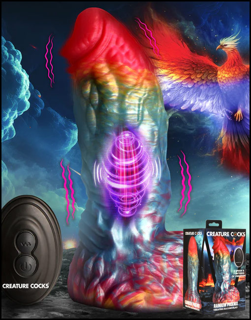 This massive, iridescent, rainbow-colored dong is inspired by the mystical firebird known as the phoenix! It has a large, tapered head, the veiny shaft is covered in feathery and mystical bumps, ridges, and textures that add delightful sensation, and the wide base has a strong suction-cup for hands-free rides! Get buzzed with the powerful vibrator that is nestled inside and choose between 3 speeds and 7 patterns of vibration that you control with the battery-operated remote! Made out of premium, phthalate-free silicone, this dong is body-safe and best used with water-based lubricants only. Use it in fantasy roleplay, kinky cosplay, and steamy self-love sessions! The soft but squishy material is also waterproof, rated as IPX6 so it can be taken in the shower but not submerged underwater. To recharge the vibrator, connect the magnetic end of the charger to magnetic points on the base of the dildo, then connect to the USB port or adapter. Power button flashes while charging. Remove from charger promptly once fully charged. Replace the remote's battery as needed. To clean, wash with warm water and mild soap, then rinse it off and spray with a toy cleaner. Pat dry and let it air out. Store out of direct sunlight or heat. Keep separate from other silicone toys.
