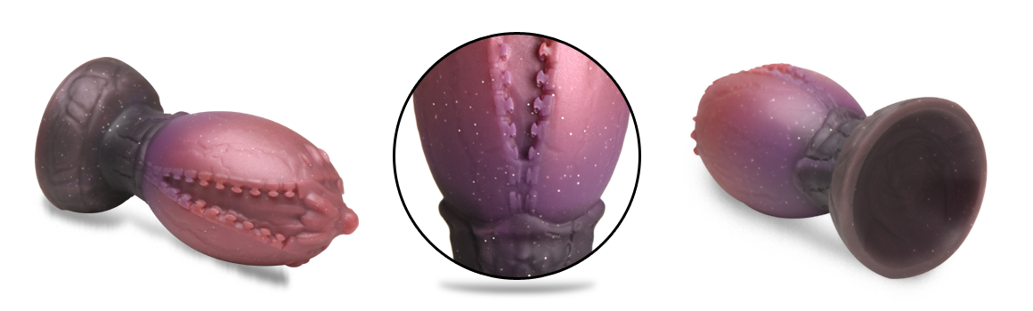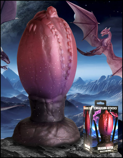 Become the Queen Mother of Dragons or the King of Dragon Eggs! This Dragon Hatch egg has begun to crack open and reveals a small, baby dragon beginning to escape! The glittery, dark red and brown egg is textured with zipper-like ridges along the crack of the egg and a tapered, dragon-head tip! The tapered tip helps you insert it and the round, wide, squishy body gives you a satisfying fill! Enjoy laying the egg as you push it out post-penetration! The egg is made from premium, phthalate-free silicone and is plush, silky smooth. Use only with water-based lubricants. After use, wash with warm water and mild soap then rinse and spray with a toy cleaner. Store in a cool, dark place.