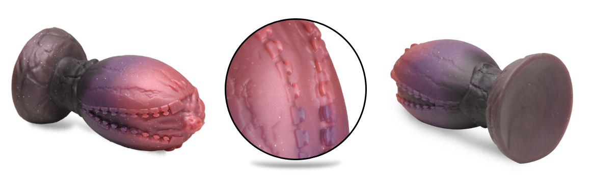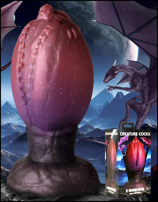 Become the Queen Mother of Dragons or the King of Dragon Eggs! This Dragon Hatch egg has begun to crack open and reveals a small, baby dragon beginning to escape! The glittery, dark red and brown egg is textured with zipper-like ridges along the crack of the egg and a tapered, dragon-head tip! The tapered tip helps you insert it and the round, wide, squishy body gives you a satisfying fill! Enjoy laying the egg as you push it out post-penetration! The egg is made from premium, phthalate-free silicone and is plush, silky smooth. Use only with water-based lubricants. After use, wash with warm water and mild soap then rinse and spray with a toy cleaner. Store in a cool, dark place.