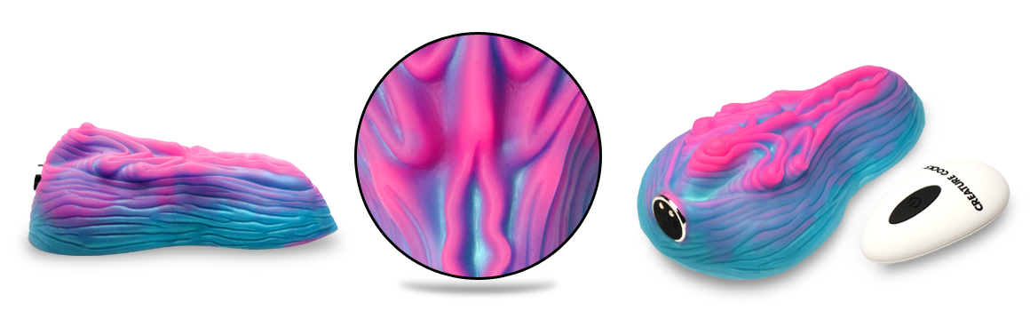 Rub against the sexiest alien you've never known with this Vulvaron vibrating grinder! The soft folds of alien lips that caress your own sensitive areas are made out of silky, flexible, premium-grade silicone and are phthalate-free and body-safe. Use it with water-based lubricants only to keep it looking and feeling new. The pink, teal, and purple folds have a powerful, rechargeable, bullet-vibrator hidden inside them that packs a powerful buzz! Enjoy 3 speeds and 7 patterns of delicious vibration that you control with the battery-operated remote! Indulge in your kinky, fantasy and sci-fi roleplay scenarios with this delicious alien vulva! After use, wash with warm water and mild soap, then spray it with a toy cleaner and pat it dry. Recharge the bullet via the USB cable provided.
