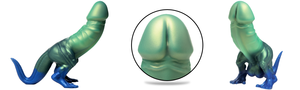 With beautiful, glittering blues, blacks, purples and teals, this Dino dong is about to outshine your other toys! With a massive, mushroom-tip head, you'll enjoy every time you pop it inside! The curved shaft has prominent veins on one side and a smooth ridge on the other. At the base are little dinosaur legs, a curved tail and a small pair of balls. It's as fun to look at as it is to ride! The wide base provides powerful suction so you can go hands-free by placing it on any flat surface to keep it in place. You can also combine it with a compatible strap-on harness for pegging play! Made out of premium, phthalate-free silicone, it has a firm core and soft, silky surface. Explore every sci-fi, fantasy, roleplay or cosplay scene you want with this epic adult toy! Use only with water-based lubricants for best results. After play is over, wash the dildo with warm water and soap and use a toy cleaner to spray clean. Wipe dry and store in a cool, dark place out of direct sunlight.