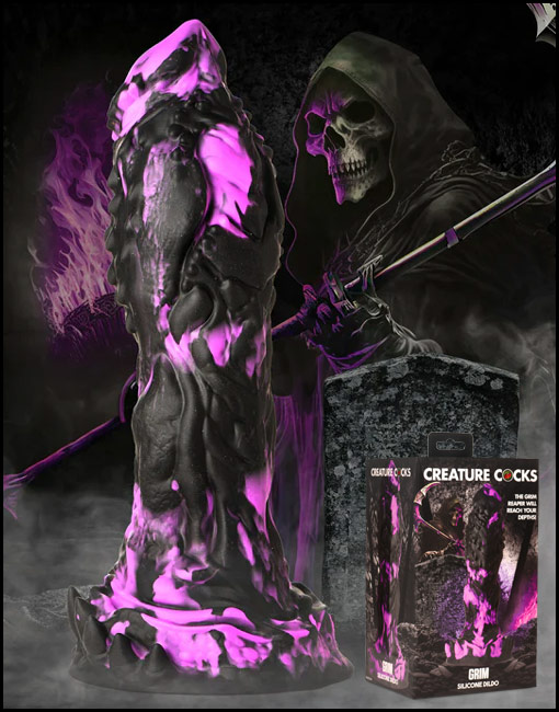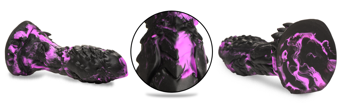When death comes for you, you better wish that the Reaper is this hot! This purple and black dildo is menacingly large with textured ridges, nubs, grooves and spikes on it. The edge of the corona is rimmed with spiked nubs and is wider at the top then the middle. The wide base provides powerful suction so you can go hands-free by placing it on any flat surface to keep it in place. You can also combine it with a compatible strap-on harness for pegging play! Made out of premium, phthalate-free silicone, it has a firm core and soft, silky surface. Explore every sci-fi, fantasy, roleplay or cosplay scene you want with this epic adult toy! Use only with water-based lubricants for best results. After play is over, wash the dildo with warm water and soap and use a toy cleaner to spray clean. Wipe dry and store in a cool, dark place out of direct sunlight.