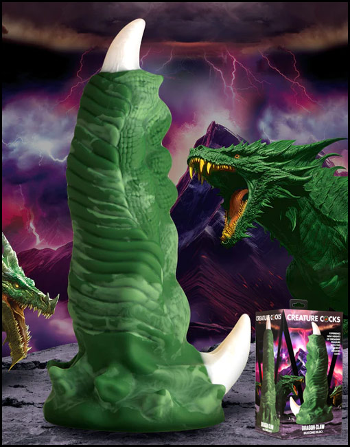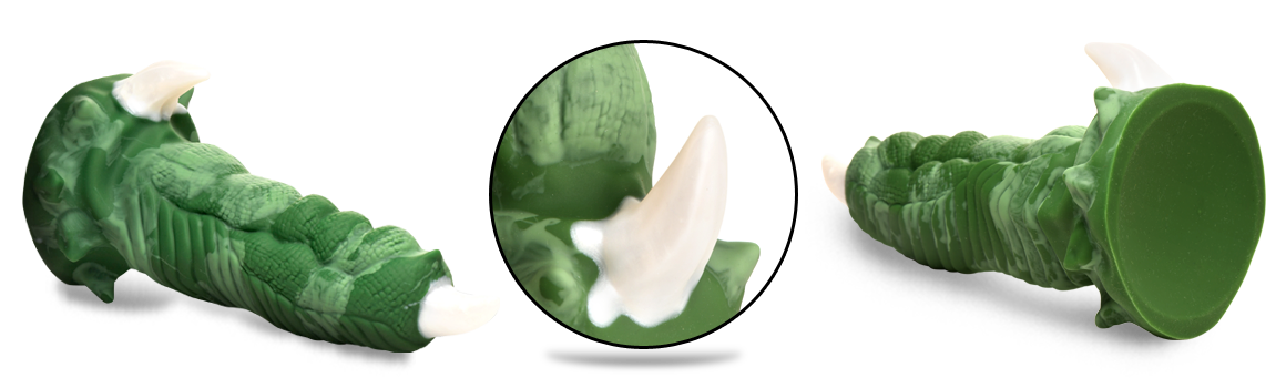The dragon reaches for you, slides inside, and its green finger tipped with a tapered, white talon rocks your world! Every texture makes your eyes roll back in your head! The ribbed scales and the bumpy lizard skin combine for a mythical and epic experience! Made out of premium, flexible, phthalate-free silicone, this dong is body-safe and best used with water-based lubricants only. Enjoy hands-free rides due to the strong suction cup base! Invite a partner to indulge in kinky cosplay or fantasy roleplay and use their favorite harness to transform this dong into a strap-on! Afterward, make sure to wash it with warm water and mild soap, then spray it with a toy cleaner and air-dry. Keep out of direct sunlight and heat.