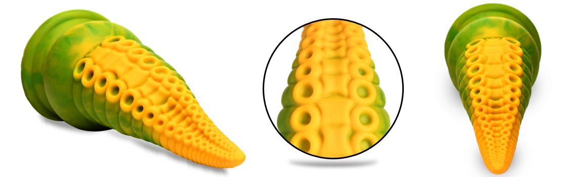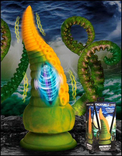 Enjoy your favorite Creature Cocks dildo with this vibrating Monstropus Tentacle! This yellow and green tentacle is massive and thick. The tapered tip helps with insertion, but from there on you can enjoy deep stretching as you fill yourself up with this firm yet squishy rod! Covered in suckers, this uniquely textured shaft stimulates you in new and spectacular ways! To add to the sensations, there's a powerful vibrator inside of the toy that packs 3 speeds and 7 patterns of vibration! Take this monster tentacle inside of you while enjoying the deep, powerful, rumbling vibrations! This toy is perfect for solo play and has a strong, suction-cup base for hands-free riding! Combine it with a compatible strap-on harness and enjoy some serious pegging fun! Indulge in any kinky cosplay, fantasy roleplay, or deviant desire, and rest easy knowing this rod is made out of premium, phthalate-free, body-safe silicone! Rated IPX6, it can be taken in the shower but cannot be submerged underwater. To recharge, use the USB cable provided. After play, wash with warm water and mild soap, then rinse and spray with a toy cleaner before patting dry. Use only with water-based lubricants for best results.