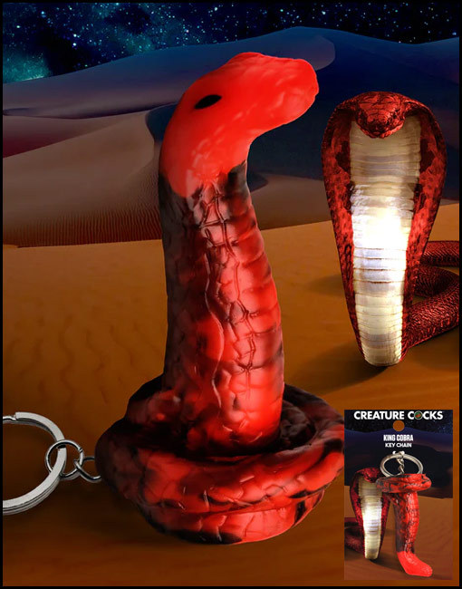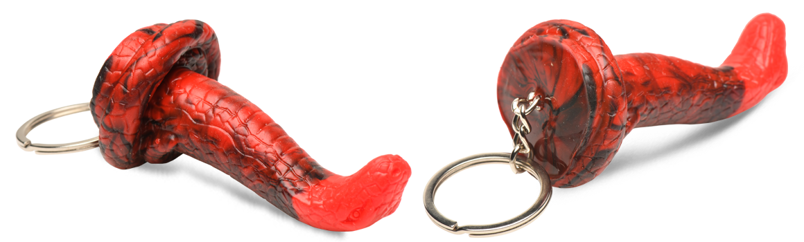 This King Cobra snake has shrunk down to travel with you wherever you go! Let your freak flag fly with these Creature Cocks keychains! Show off that you're into fantasy roleplay, mythical sex, or hot horror monsters! Place them with your keys, attach them to your phone case, clip them onto a bag or purse, or hang them from your rearview mirror to add a little flair and kinky fun! All the little dongs are made out of premium, phthalate-free, body-safe silicone and the metal is nickel-free for sensitive skin. Not meant for internal use. Novelty item only.