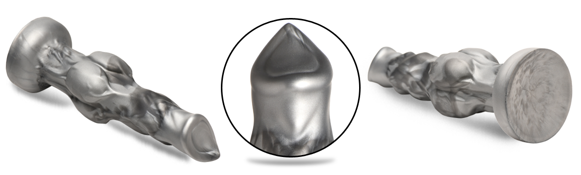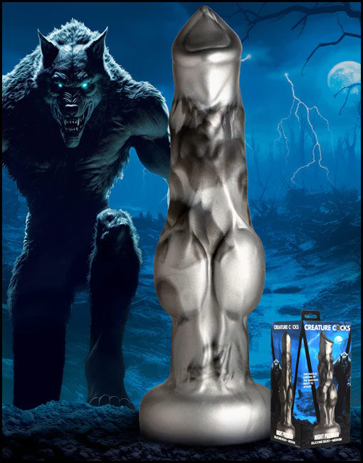 This silver and smoky black rod is iridescent and shines in the dim moonlight! The Night Prowler dong is from a beastly wolfdog that can smell your desire from miles away! The tapered tip makes it easy to insert. The veiny shaft is firm yet flexible, thick but squishy. Above the base are 4 ball-like knots to add extra stretch when you get it deep inside. The wide, flanged base makes it harness-compatible and gives it a strong, suction cup base for hands-free fun! Made out of premium, phthalate-free silicone, it has a firm core and soft, silky surface. Explore every sci-fi, fantasy, roleplay, or cosplay scene you want with this epic adult toy! Use only water-based lubricants for best results. After play is over, wash the dildo with warm water and soap and use a toy cleaner to spray clean. Wipe dry and store in a cool, dark place out of direct sunlight.