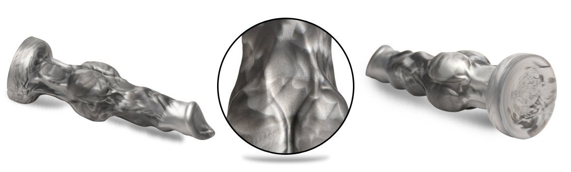 This silver and smoky black rod is iridescent and shines in the dim moonlight! The Night Prowler dong is from a beastly wolfdog that can smell your desire from miles away! The tapered tip makes it easy to insert. The veiny shaft is firm yet flexible, thick but squishy. Above the base are 4 ball-like knots to add extra stretch when you get it deep inside. The wide, flanged base makes it harness-compatible and gives it a strong, suction cup base for hands-free fun! Made out of premium, phthalate-free silicone, it has a firm core and soft, silky surface. Explore every sci-fi, fantasy, roleplay, or cosplay scene you want with this epic adult toy! Use only water-based lubricants for best results. After play is over, wash the dildo with warm water and soap and use a toy cleaner to spray clean. Wipe dry and store in a cool, dark place out of direct sunlight.