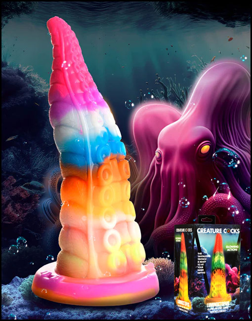 This tentacle is brightly colored during the day and glows bright in the night! It has a rainbow-sherbert array of colors and when you charge it with UV light from a flashlight or sunlight, it glows a bright neon green, cherry red, and golden-yellow in the dark. The tapered tip makes insertion easy and then the shaft gets gradually wider and bigger to stretch you the deeper you go. Textured with suckers and a tongue-like backside, you'll enjoy every inch! Made from premium, phthalate-free silicone, it has a firm core and soft, silky surface. Explore every sci-fi, fantasy, roleplay, or cosplay scene you want with this epic adult toy! The wide base is anal-safe, has a suction-cup for hands-free play, and strap-on harness compatible! Play alone or with a lover! Use only with water-based lubricants for best results. After play is over, wash the dildo with warm water and soap and use a toy cleaner to spray clean. Wipe dry and store in a cool, dark place out of direct sunlight.