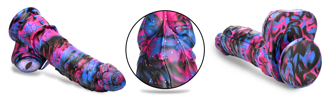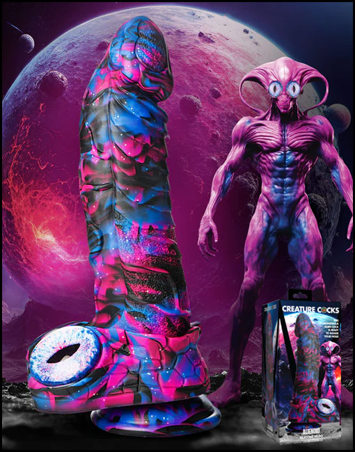 This cosmic Creature Cocks rod is an Alienoid whose member is right between its eyes! Enjoy riding its face as you enjoy this galactic star dong! It is a mix of red, purple, blue, black and specks of glitter. Truly a unique constellation, it is ready to help you blast off into another dimension of pleasure! The shaft is textured and grooved with a tapered tip for easy insertion. It has a wide, flanged base that doubles as a strong suction-cup for hands-free riding when you're solo and a safe, compatible strapon-dildo that fits most harnesses for couple's play and pegging. Made out of premium quality, phthalate-free, body-safe silicone, it is best used with water-based lubricants only. To clean it after use wash it with warm water and mild soap, then rinse and spray with a toy cleaner before letting it air dry. Keep out of direct sunlight and heat, and do not store it with other silicone toys.