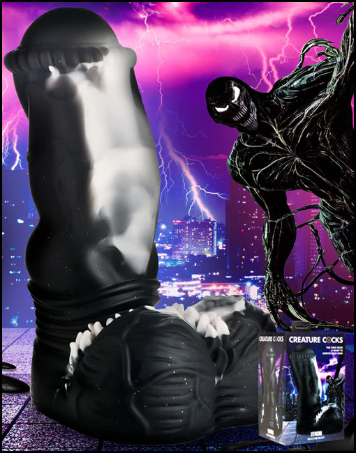 This intimidating, black and white rod belongs to the alien parasite known as Venom! This strong shapeshifter has a wide, round head with a row of beads around the crown. The thick shaft is veiny with folds of skin at the base giving it a ribbed texture. There are soft spikes around the big balls at the base. You can enjoy it hands-free or with a partner! The wide, suction-cup base has a strong seal and is harness-compatible. Made out of premium, phthalate-free silicone, it has a firm core and soft, silky surface. Explore every sci-fi, fantasy, roleplay or cosplay scene you want with this epic adult toy! Use only with water-based lubricants for best results. After play is over, wash the dildo with warm water and soap and use a toy cleaner to spray clean. Wipe dry and store in a cool, dark place out of direct sunlight.