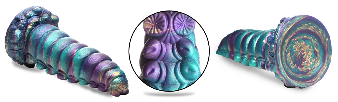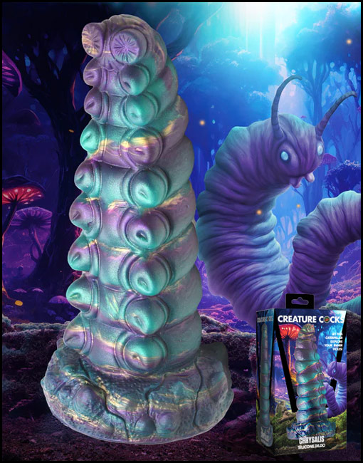 Let this alien Chrysalis climb inside! It has a beautiful teal, purple, gold and blue coloring that is iridescent and unique. The head is small for easier insertion and it gets bigger the deeper you go. Enjoy the gradually bigger, bulging segments! The unusual and stimulating textures of the feet make this a very satisfying experience! Made from premium, phthalate-free silicone, it has a firm core and soft, silky surface. Explore every sci-fi, fantasy, roleplay, or cosplay scene you want with this epic adult toy! The wide base is anal-safe, has a suction-cup for hands-free play, and strap-on harness compatible! Play alone or with a lover! Use only with water-based lubricants for best results. After play is over, wash the dildo with warm water and soap and use a toy cleaner to spray clean. Wipe dry and store in a cool, dark place out of direct sunlight.