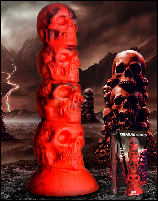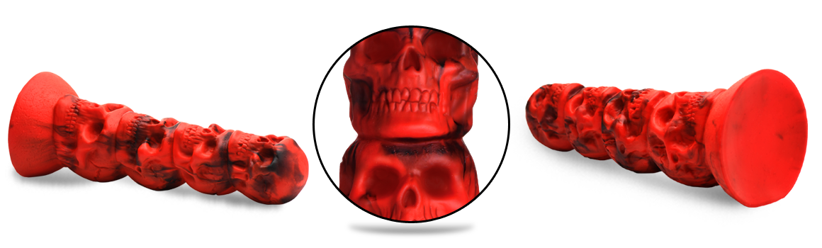 This hellspawned Creature Cock dildo is truly inspired by horrors and dark magic! The tower of skulls is 4 red skulls with different shaped eye sockets and jaws stacked upon each other. Enjoy the round head that penetrates and the dozens of grooves and ridges from the unique texture! Made out of premium, silky smooth, phthalate-free silicone it has a squishy outside and firm, flexible core that is body-safe. Only use water-based lubricants for best results. The strong, suction-cup base lets you ride hands-free when it's placed on any flat surface. It's harness-compatible so you can enjoy it with a partner or attach the harness to a chair or bench. Enjoy your kinky cosplay, fantasy roleplay, and self-pleasure with this fantasy dildo! After play, wash with warm water and mild soap then spray with a toy cleaner and let it air dry.