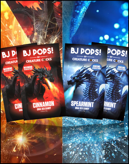 Display your BJ Pops! Candy with two fire and ice dragons on the front! The eye-catching display holds 4 pieces for clients and customers to grab easily, purchase, and enjoy! Encourage them to indulge in a playful, nostalgic candy with an adult twist. Once this candy is exposed to water or saliva, these sizzling, fizzing, popping candies stimulate the mouth and any other body-part they come into contact with! Enhance oral sensations and enjoy the warming cinnamon or cooling spearmint flavors!
