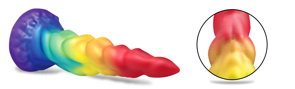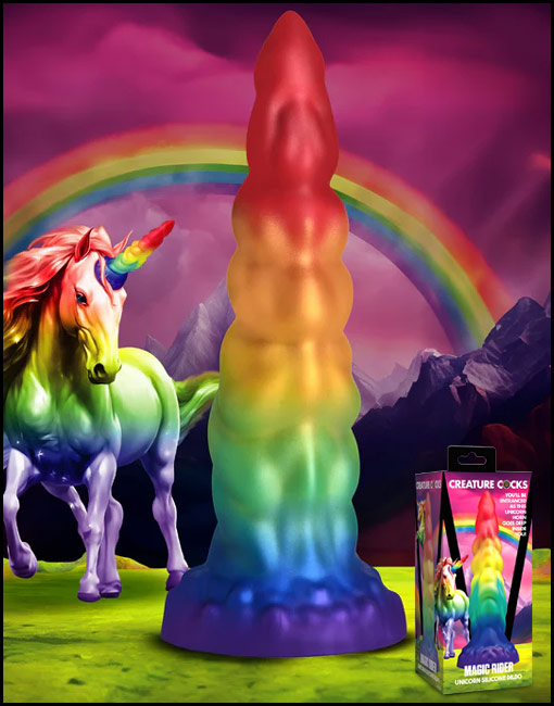 Indulge in this fantastical unicorn and enjoy this iridescent, shiny, rainbow horn! The tapered tip of the horn makes insertion easy and it gets wider the deeper you go! Enjoy the larger and larger ribs along the shaft as you get deeper. The wide base provides powerful suction so you can go hands-free by placing it on any flat surface to keep it in place. You can also combine it with a compatible strap-on harness for pegging play! Made from premium, phthalate-free silicone, it has a firm core and soft, silky surface. Explore every sci-fi, fantasy, roleplay, or cosplay scene you want with this epic adult toy! Use only with water-based lubricants for best results. After play is over, wash the dildo with warm water and soap and use a toy cleaner to spray clean. Wipe dry and store in a cool, dark place out of direct sunlight.