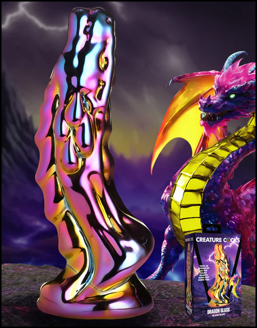 Experience mythical pleasure with the Dragon Glass Glass Dildo. Its design, reminiscent of a dragon's head and neck, features an arched curve, a delightfully bumpy spine, and a tapered tip, all in an iridescent metallic yellow-pink shade with blue dapples. This beautiful toy is made from sturdy borosilicate glass, ensuring it is non-porous and compatible with any lubricant. Notably heat-sensitive, it adapts quickly to your body's warmth. The unique texture is crafted to rub and stimulate your erogenous zones, providing endless pleasurable possibilities.