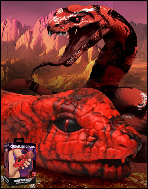 You slide your palm over the length of the serpent. It coils around your wrist, tightly squeezing as it writhes against you. Your movements are slow, deliberate. It begins to taste the air around your crotch, and then begins to slither between your thighs. "What is it doing?" you wonder, and then with horror you realize it must mistake your member for some kind of prey! Sure enough, the snake opens its mouth and you feel it wrap its jaw around you! You reach to grab it, but its long body is still wrapped around your arm. Then it starts to suck, to pulse, to swallow… and you're enjoying yourself too much to stop now!