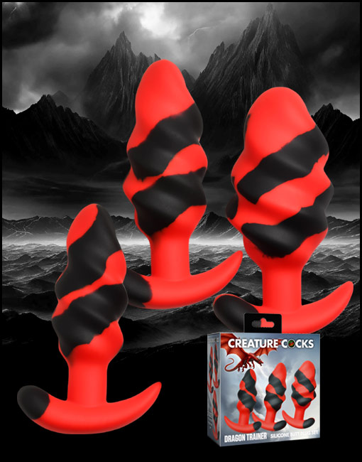 The Dragon Trainer Silicone Butt Plug Set includes three progressively sized plugs made from premium, phthalate-free silicone. Each plug features a textured dragon-inspired design that adds dimension while supporting gradual size progression. The smooth silicone surface allows for comfortable insertion, and the flared base provides stability during use. This three-piece set offers a structured approach to anal training in a bold, fantasy-inspired design.